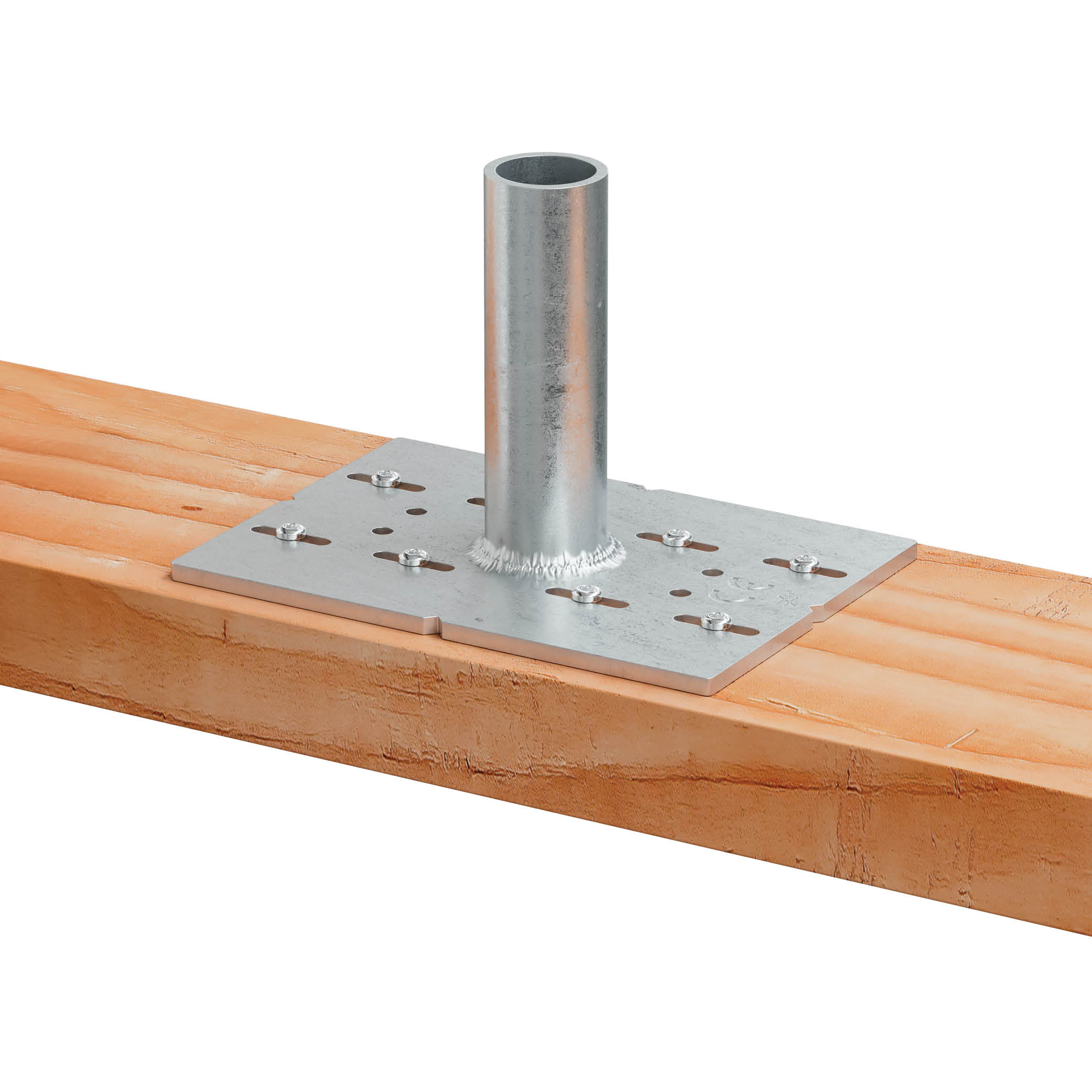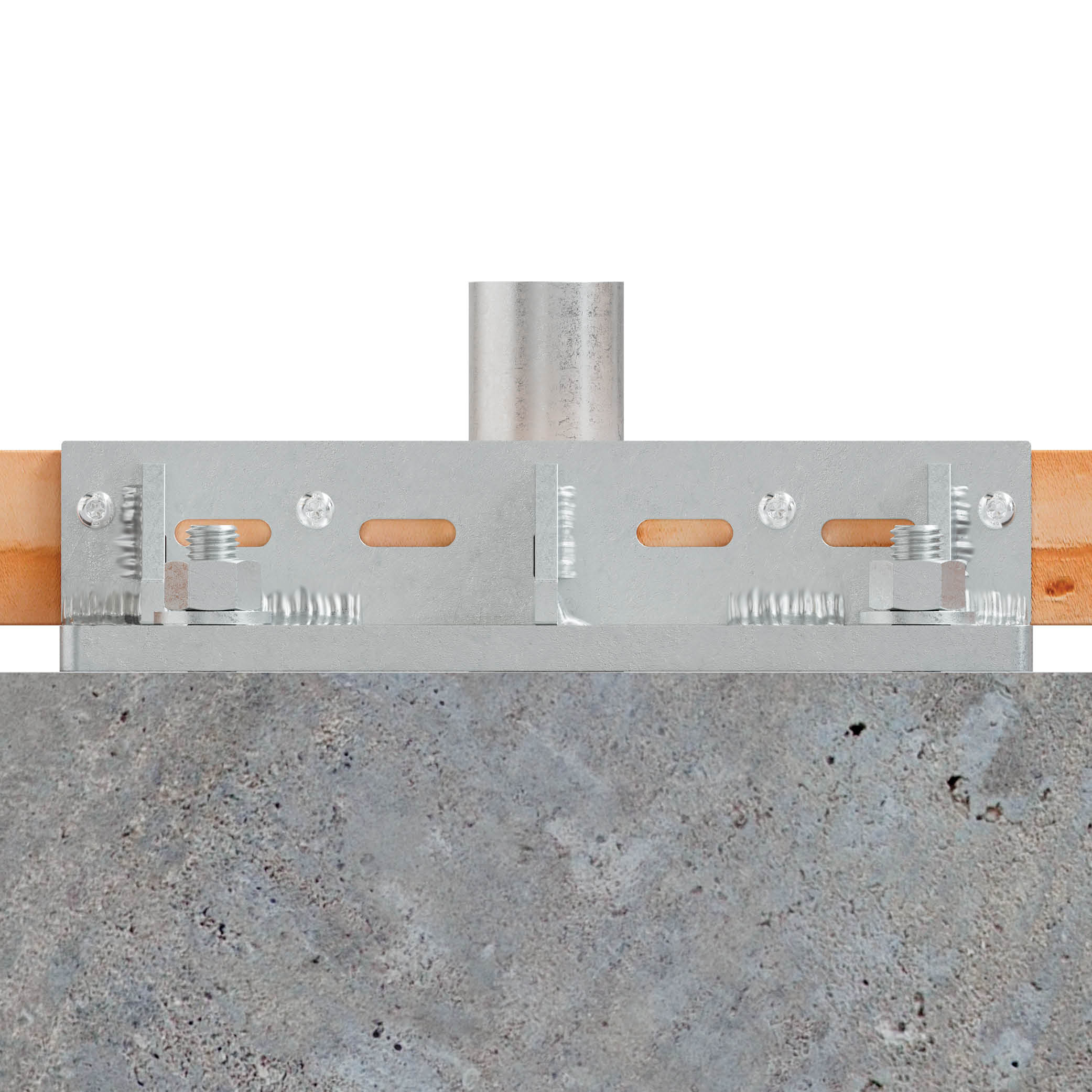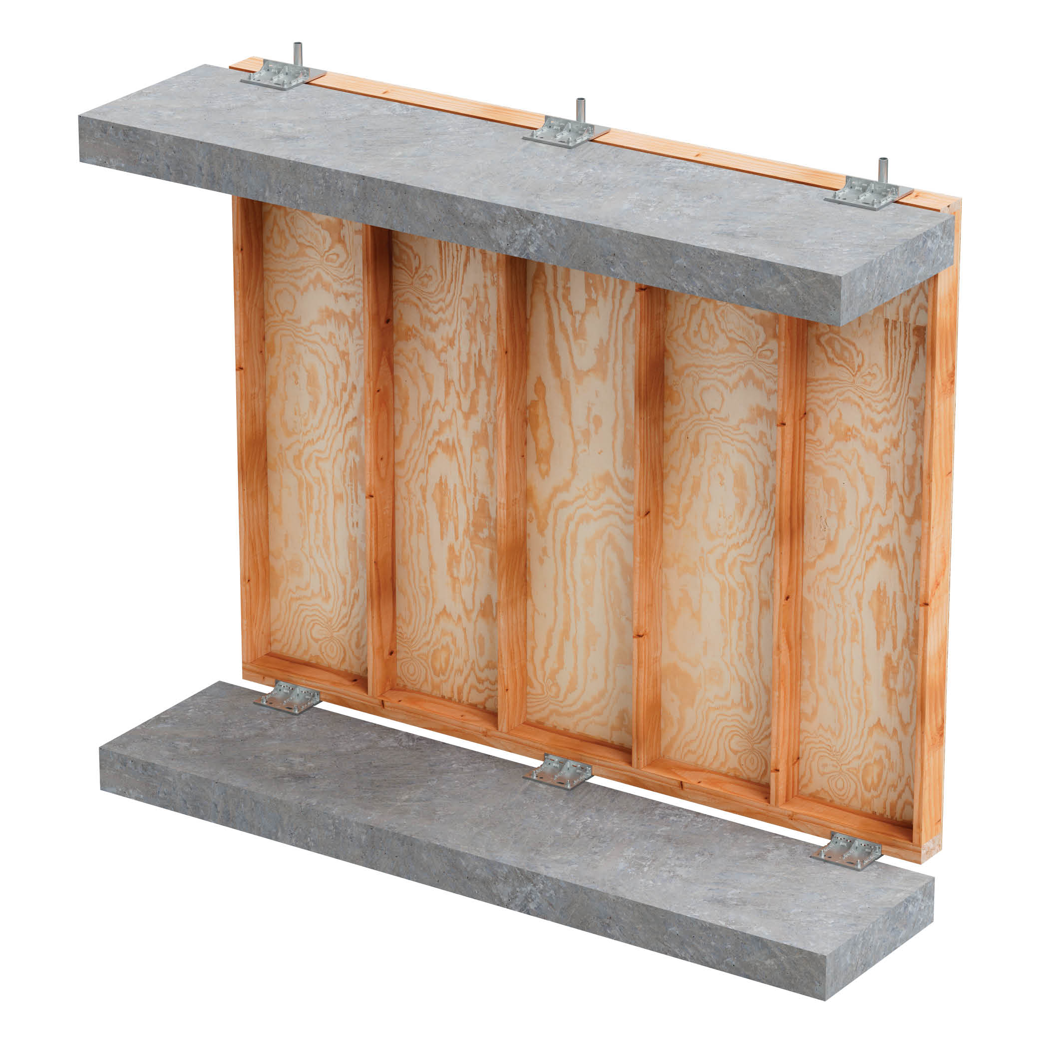 - Eleve a parede de madeira e coloque-a sobre vários BFOB, depois fixe-a com parafusos CSA (verifique os padrões de fixação). Utilize os orifícios oblongos nos conectores laterais e os orifícios circulares no conector central.
